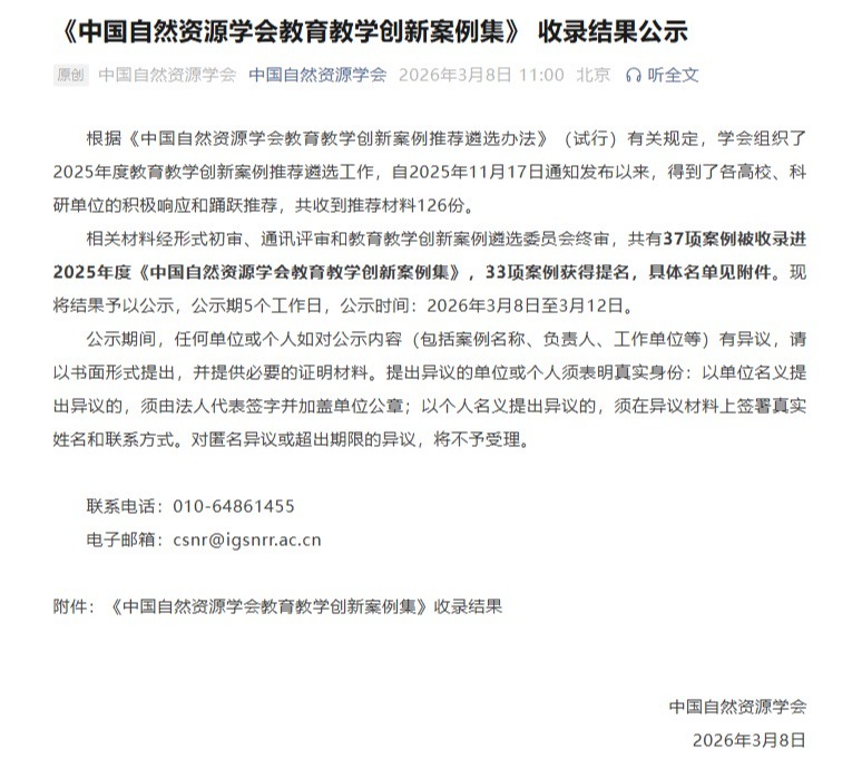 2026年3月8日,中国自然资源学会公示2025年度教育教学创新案例收录结果,91网站