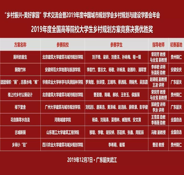 领导老师们每周对参赛作品组织评议,给予修改建议。11月2日,三支队伍均顺利向主办方提交了完整的参赛作品,其中两只队伍获得省级奖项并进入全国决赛。12月7日,中国城市规划学会乡村规划与建设学术委员会年会上,宣读了全国决赛获奖名单,其中我院师生的《厕隐竹林》作品在乡村户厕设计方案竞赛单元评选中获得全国优胜奖。