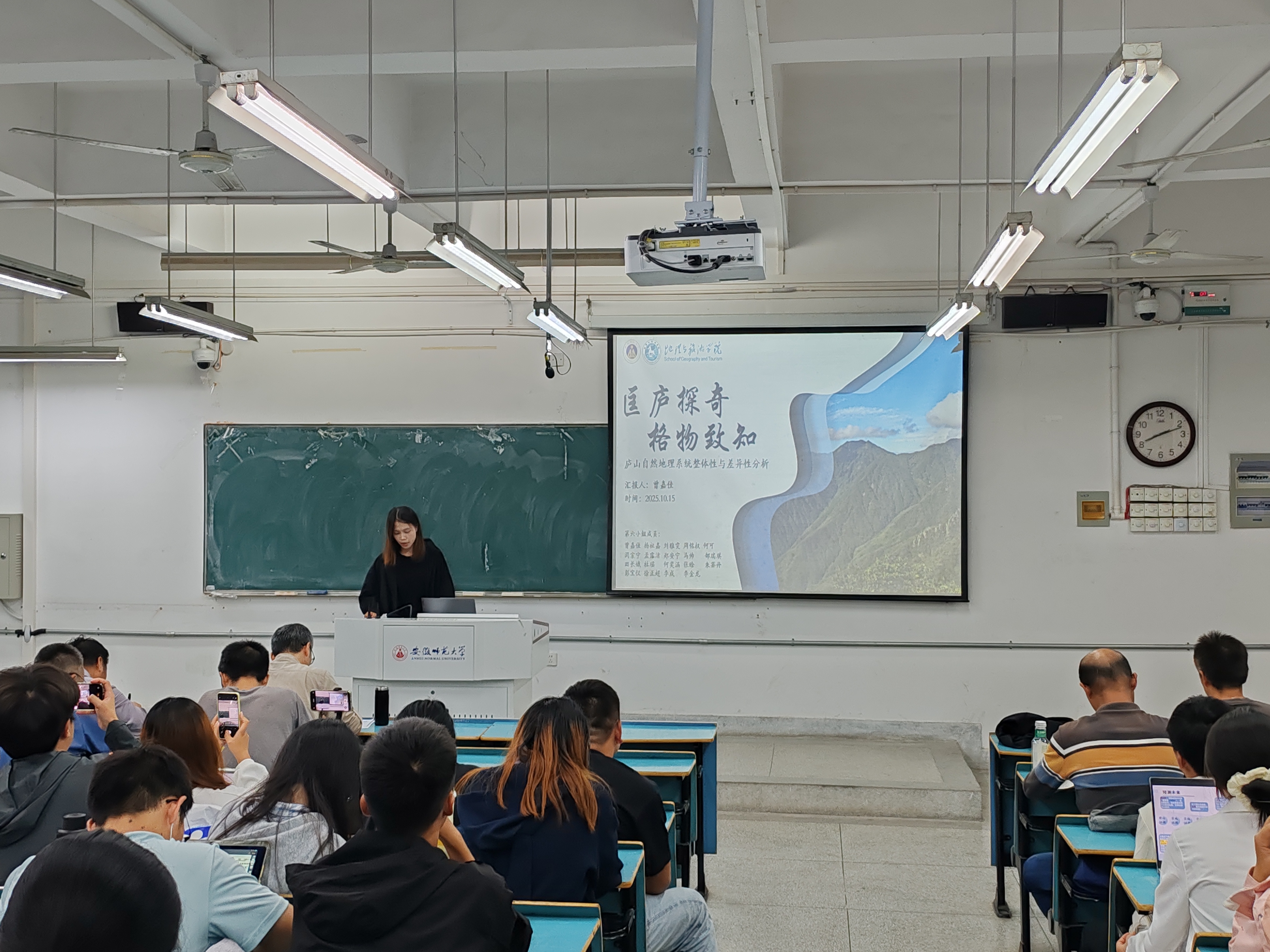 在汇报答辩环节,各实习小组围绕庐山自然地理的多元要素展开了系统梳理与精彩展示。汇报内容涵盖广泛,从基础地质构造到地表生态响应,全面展现了庐山自然地理环境的系统性与复杂性。同学们的研究主题深入庐山自然地理的多个核心领域:在地质基础方面,有新构造运动的地质地貌证据探讨;在气候水文领域,有对独特山地气候与水环境特征的深入解析;在生态研究方面,既有对黄山松林群落结构的细致探究,也有对植被垂直分布规律的宏观把握;同时还有从地形因子角度对土壤发育过程的专门研究,以及对地貌发育特征的系统梳理;部分小组还尝试从系统论角度,对庐山自然地理环境的整体性与差异性进行综合分析。